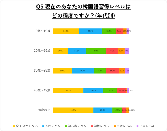 韓国語の現在のレベルは、10代、40代、50代では「全くわからない」が最も多くなりましたが、20代では「初心者レベル」が、30代では「入門レベル」が最も多くなり、20代が特に韓国語学習を熱心に行っている様子が伺えました。