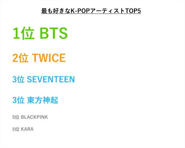 韓国語学習者の中で、好きなK-POPアーティストがいるか聞いたところ61.8%が「はい」と回答し、最も好きなアーティストはBTS、TWICE、SEVENTEEN、東方神起が3位までを占め、比較的長期間活動するアーティストが韓国語学習へのモチベーションに繋がっている様子が見受けられました。その後には、BLACKPINK、KARAと女性K-POPアーティストが続きました。