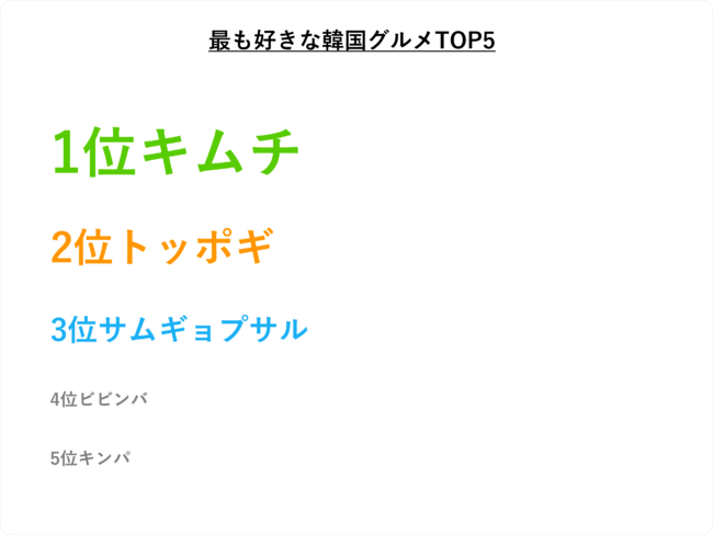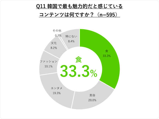 韓国で最も魅力的だと感じているコンテンツに対する質問では、33.3%は「食」が占めました。最も好きな韓国グルメについてアンケートを行ったところ、キムチ、トッポギ、サムギョプサル、ビビンバ、キンパと、国内でも口にすることの多い韓国グルメがトップ5にランクインしました。そのほか、インスタ映えスイーツとして話題のトゥンカロンや、韓国発の激辛麺として知られるブルダック麺などもピックアップされました。