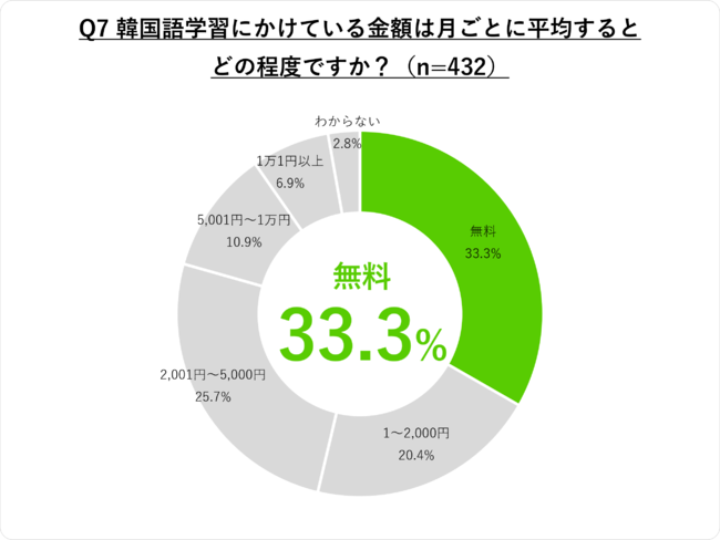 「韓国語学習は何を活用して行っていますか?(複数回答)」という質問では、動画を使っている人が47.5%、アプリが45.6%、教本が36%となっており、オンラインレッスンや対面語学教室を圧倒的に抑える結果となりました。さらに、月ごとの韓国語学学習にかけている金額は3分の1が無料と回答し、5,000円以下が8割程度という結果に。比較的、自力でリーズナブルに学習する人が多い結果となりました。