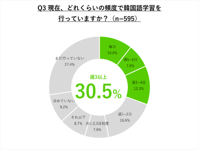 1.約3割が週3回以上韓国語学習を実施!学習している人の内、2人に1人が1日あたり30分以上学習中
