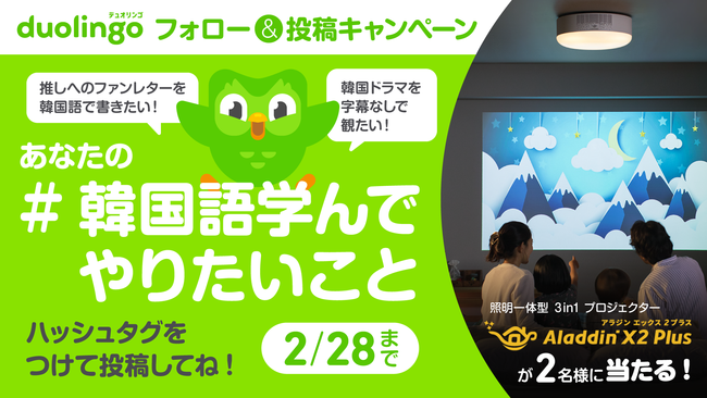 韓国語コース2周年を記念し、公式Twitterでは「#韓国語学んでやりたいこと」で投稿をすると、「おうちを、魔法の暮らし空間に。」をコンセプトに展開する世界初の3in1プロジェクター「Aladdin X2 Plus」が当たるキャンペーンを開催します。さらに、2月19日(日)には新大久保の盛好堂前で、韓国語コース2周年を記念した号外を、公式キャラクターの「Duo」が配布するほか、2月16日~28日には韓国語コースで勉強してくれている方々の声を新大久保の大型ビジョンで放映するなど、韓国語を学習する方々を盛り上げます。
