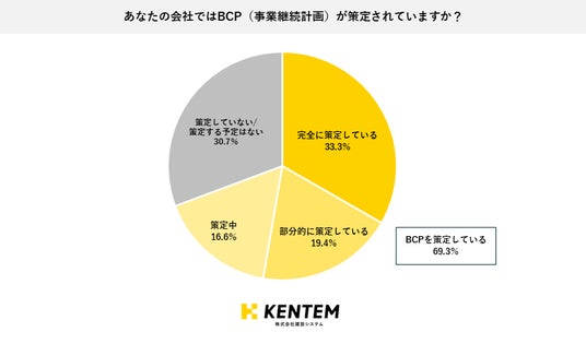 BCP(事業継続計画)の策定状況について聞いたところ、33.3%が「完全に策定している」と回答しました。「部分的に策定している」「策定中」と回答した人を合わせると、BCPを策定している企業は69.3%となりました。