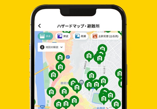「クロスゼロ」はスマートフォンの位置情報をオンにすることで、ハザードマップや近隣の避難所を確認することができます。