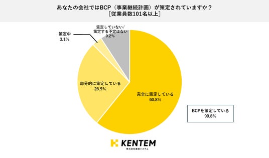 また、企業規模ごとに集計すると101名以上の従業員を抱える企業の60.8%が「完全に策定」しており、「策定中」も含めると90.8%の企業がBCPを策定しているという結果となりました。