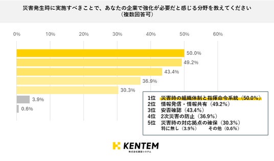 さらに『災害発生時に実施すべきことで、あなたの企業で強化が必要だと感じる分野を教えてください(複数選択可)』と質問しました。