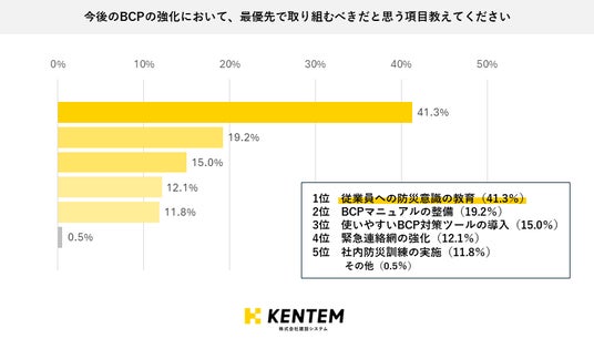 『今後のBCPの強化において、最優先で取り組むべきだと思う項目』を問う設問への回答で最も多かった回答は「従業員への防災意識の教育」で41.3%でした。