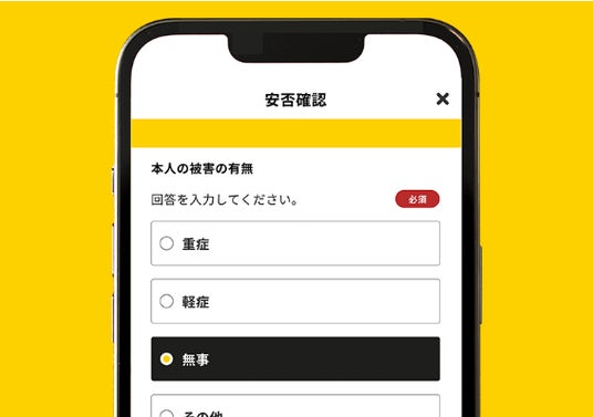 気象情報と連携して発災時に安否確認を自動配信。配信条件は、地震の震度や津波警報・大雨特別警報などの気象情報を指定することができます。