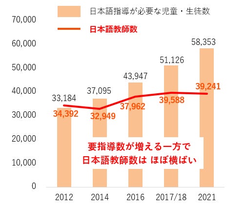 海外から日本に帰国した、外国で生まれて日本に来た、日本生まれだが保護者の母語が日本語ではない等の理由から、日本の学校においても、日本語の支援を必要としている子どもたちがいます。文部科学省の調査では「日本語指導が必要な児童生徒」は年々増加し、2021年度には約5.8万人に達しています。こうした子どもたちの支援の多くは、自治体や学校、地域の市民団体等に担われていますが、地域による支援体制のばらつきも大きく、子どもたちは授業や学校生活の中で、つまずきを抱えてしまうことがあります。