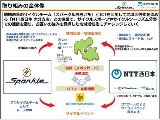 プロサイクルチーム「Sparkle Oita Racing Team(監督兼GM 黒枝 美樹、以下 スパークルおおいた)」を運営する3SEEDS株式会社(代表取締役 黒枝 士揮)と西日本電信電話株式会社 大分支店(支店長 三笘 博幸、以下NTT西日本 大分支店)は、ICTを活用したサイクルツーリズムの振興や自転車を活かした地域づくりの推進を目的として、連携協定を締結いたしました。