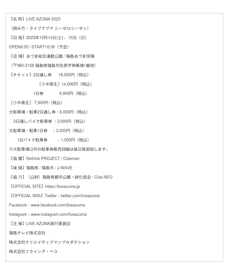 2022年に初開催され、東北・福島の地に新たな音楽フェスの文化を花開かせたLIVE AZUMAの第3弾アーティストと日割りが決定しました。