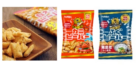 北陸で長く愛され続けている揚げあられ。北陸限定フレーバーのしろえびビーバー、かにビーバー、ふぐビーバーを販売予定。