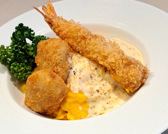 石川県金沢の名物の料理。オムライスの上に白身魚のフライとエビフライを乗せ笠原流タルタルソースを合わせてお召し上がりいただきます。