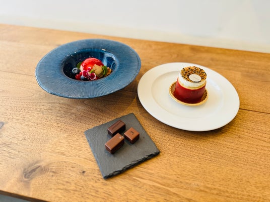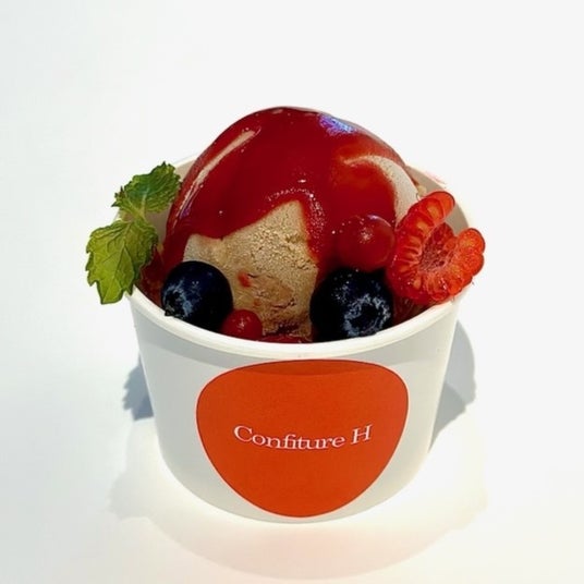 辻口博啓シェフの地元である石川県七尾市能登島の和紅茶いやひめを使用したアイス。いやひめは花のような甘い香りとほのかな甘味が特徴。フレッシュなベリーとソースをトッピング。パイ生地の食感がくせになります。