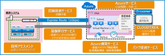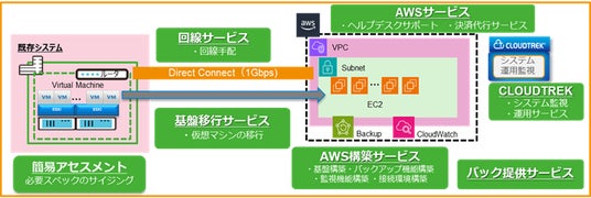 - 内容:簡易アセスメント、オンボード支援、クラウド基盤構築、移行作業、運用監視、専用回線