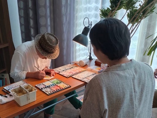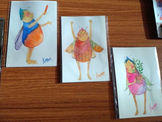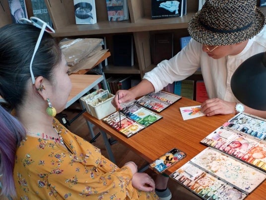 透明水彩とペンを使って、ファンタジーな世界を描く松野和樹。こんな時にビリケンさんがいてくれたらなぁ…というエピソードと好きなお色など、おしゃべりをしながら、その人のためだけにポストカードサイズのビリケンさんを描くワークショップ。