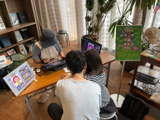 イベント会場である枚方在住で、ごっつええ感じ、北斗の拳、うんこドリルなどを手掛けたイラストレーター・ウラタスパンコールによる似顔絵ワークショップ。