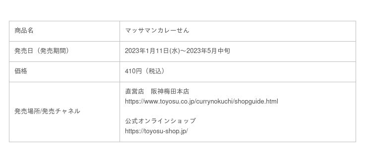 とよす株式会社(本社:大阪府池田市 社長:眞田 昌彦)は、百貨店を中心に展開しているブランド「カレーのくち」において、『カレーのくち マッサマンカレーせん』を2023年1月11日(水)から期間限定で発売いたします。