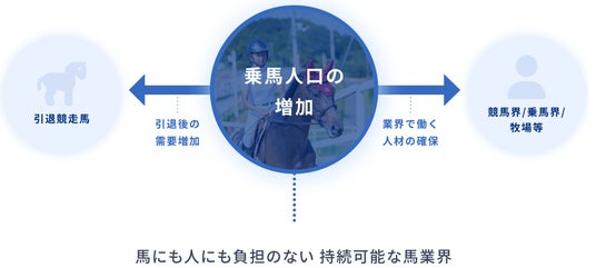 競走馬は5歳前後で競馬を引退することが多い一方でその寿命は25歳前後と長く、競馬引退後の馬の処遇が社会課題になっています。そのようなことから各ステークホルダーの持つ多様な強みを結集し、それぞれがつながり、取り組みを共創することによって全ての競走馬にサステナブルな未来の実現を目指しています。