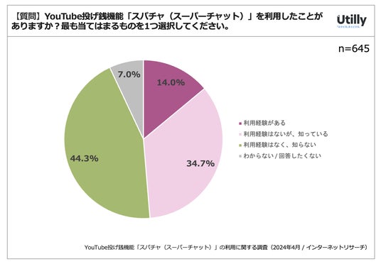スパチャの認知率は48.7%、利用率は14%という結果になった。一方、44.3%は「スパチャを利用したことがなく、知らない」と回答した。