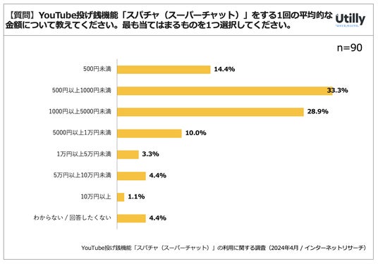 YouTube投げ銭機能の利用者の1回あたりの平均利用金額は500円以上1,000円未満がで33.3%を占める結果となった。全体として1,000円未満と回答した割合が47.7%だった。