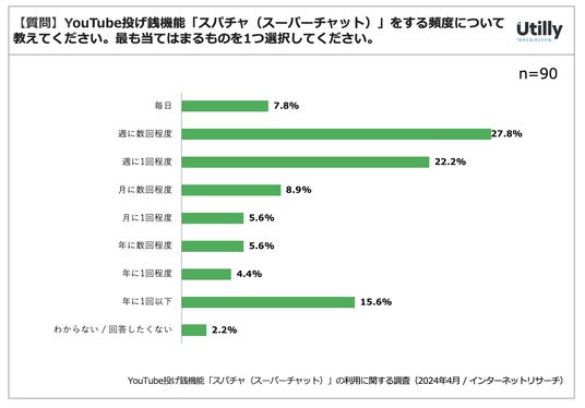 スパチャ利用者の利用頻度については週に1回~週に数回程度が50%でボリュームゾーンとなった。一方で、7.8%は毎日投げ銭をしていると回答した。