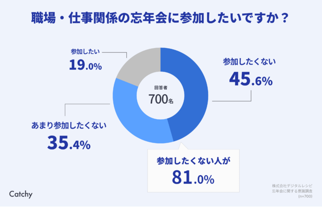 「職場・仕事関係の忘年会に参加したいですか? 」(n=700)と質問したところ、「参加したくない」(45.6%)、「あまり参加したくない」(35.4%)、「参加したい」(19.9%)という結果に。