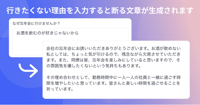 忘年会に参加する人のうち約47%が「断りにくいから」「職場の人間関係に影響が出そうだから」参加するという調査結果を受け、「上手に忘年会を断る文章」を生成するAIをリリース。