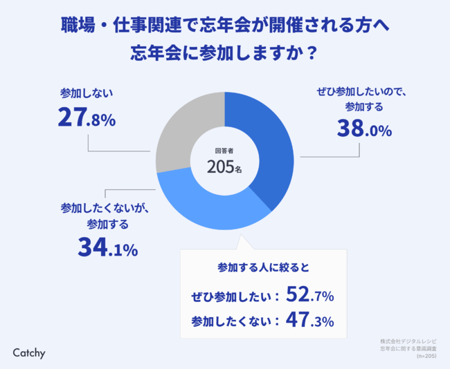 忘年会へ実際に参加する人に絞ると、「ぜひ参加したい」人は52.7%、「参加したくない」人は47.3%という結果に。