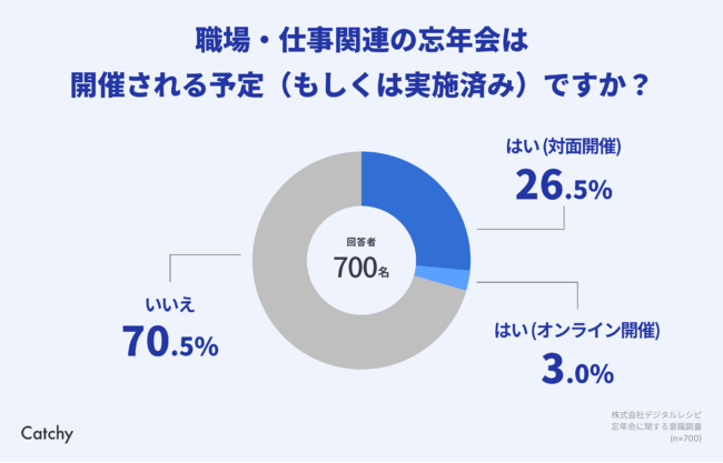 「職場・仕事関連の忘年会は開催される予定(もしくは実施済み)ですか?」と質問したところ、実際に仕事関連の忘年会の予定がある人は3割程度でした。