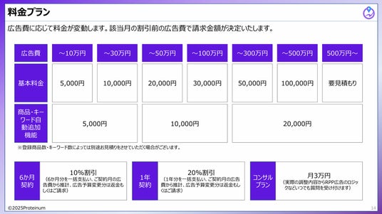 RPP広告の月額広告費に応じた料金設計となっております。(広告費は割引前の広告費が対象となります。)商品・キーワード自動追加機能については、別途追加料金となります。