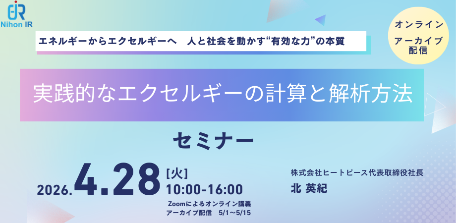 アイアール技術者教育研究所は、エクセルギーの基礎概念から、熱・化学エクセルギーの実践的な計算方法、材料製造やガスタービン等のケーススタディまでを例題・演習を交えて解説する公開セミナーを開催します。