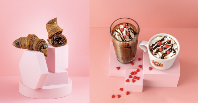 今回一緒に発売されるプレミアムチョコクロもビターチョコレートを使用している商品なので、「ハートトッピングショコラスムージー」「ハートトッピングショコララテ」のホイップをのせて食べても美味しい味の変化を楽しむことができます。ぜひこの時期限定のプレミアムチョコクロ、ドリンクのチョコレートづくしでハッピーなバレンタインを楽しんでください。