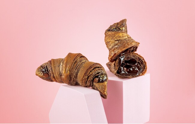 今回、『私のためのバレンタイン』がテーマなこともあり贅沢で濃厚なチョコレートを味わってもらいたいという想いから、生地自体にもココアを練りこみました。生地自体に何かを練りこむのは今回のプレミアムチョコクロが初めてです。クロワッサン生地のサクサク食感はそのままに、ココアの風味も楽しめる特別な生地を使用しています。その生地の中には、チョコレート とほんのりビターなガナッシュをたっぷり詰めこみ、甘くとろけるくちどけの中にビターのより濃厚なカカオの味わいを楽しんでいただけます。生地の上部に散りばめた金粉は、キラキラと光るゴージャスな贅沢さを演出しています。