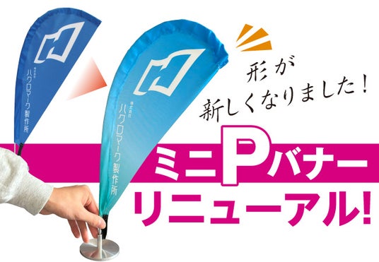 形が新しくなった『ミニPバナー』が、2月1日オーダーのぼりドットコムより発売開始されました。従来の形よりも先端に丸みを帯び、よりスポーティでスタイリッシュになりました。しかもポータブルなので、イベントや販促活動にも最適です。ぜひ、新しくなった『ミニPバナー』をお試しください。