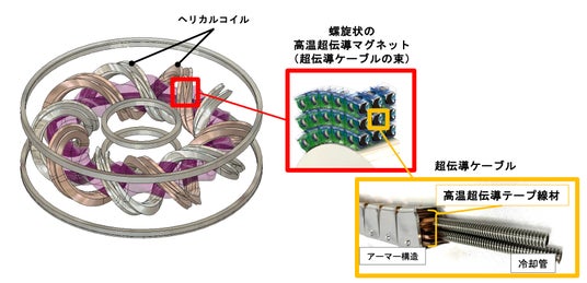Helical Fusionが開発するヘリカル型核融合炉の中心部では、螺旋状の高温超伝導マグネットでプラズマを閉じ込める。高温超伝導テープ線材を束ねて作る、曲げやすく高性能なマグネットを独自に開発している。