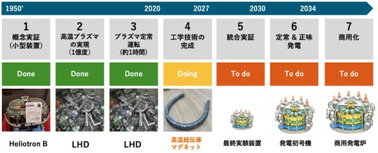 Helical Fusionでは、2034年に正味発電が可能な発電初号機の定常運転を目指し、2030年までに全ての要素技術を合わせた統合実証を行う予定です。統合実証に向け、高温超伝導マグネットの開発・試験を今後数年間で完了させる計画であり、直近では円形型マグネット実証実験を今年中に実施予定です。同試験では、世界的な開発競争においてフロントランナーとしてのポジションを示す大電流での実証結果実現を目指しています。