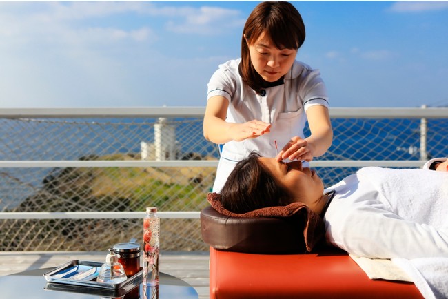 浴室は壁面と床タイルを改修し、ヒノキの香りでリラックス効果を高めます。窓の外には、大島の大自然が広がります。ゆっくり湯船に浸かりながら、癒しのひとときをお過ごしください。お部屋でゆっくり過ごすなら、鍼灸と