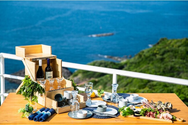 オプションでお申し込みいただけるお食事コースは一品ずつ地産地消を第一に考え、新鮮な玄界灘の天然地魚や旬の食材を使用。その素材の良さを生かしつつ、地元で人気の調味料で一工夫することにより、他にはない新たな地産地消のコラボレーションが生まれました。前菜からデザートまで大島を存分に味わえるメニューとなっております。ワインセラーには、ワイン業界の最高峰、マスター・オブ・ワイン(※)のお店「山仁」にセレクトしていただいた、ワインや日本スピリッツ等を適正な温度で保管しております。