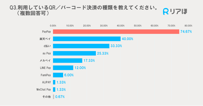 利用しているQR/バーコード決済の種類については、「PayPay」が圧倒的1位の74.67%、次いで「楽天ペイ」が40%となりました。複数回答のため、複数選択する方の割合も多く、QR/バーコード決済の中でも用途や店舗に応じて使い分けていることが伺える結果となりました。