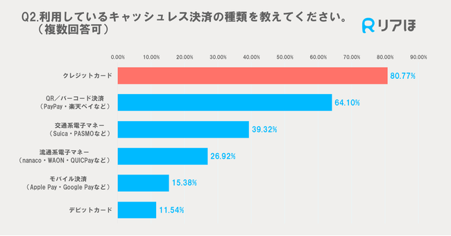 Q1で「よく利用している」「たまに利用している」と回答した方に、利用しているキャッシュレス決済の種類を質問したところ、最も多かったのが「クレジットカード」の80.77%、次いで「QR/バーコード決済」の64.1%となりました。