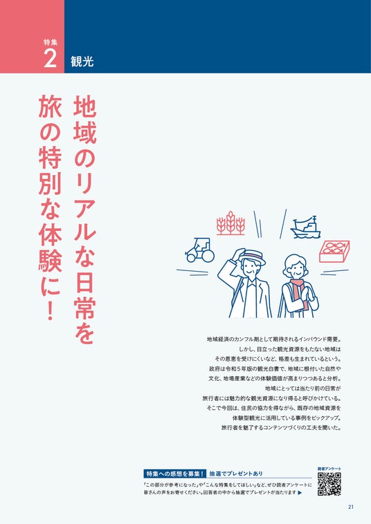 今号の特集1では、「[インフラ維持管理]“選択と集中”により生活インフラのあるべき姿を見直す。」をテーマに、富山県富山市、愛知県豊田市、北海道札幌市などの事例をご紹介しております。特集2では、「[観光]地域のリアルな日常を旅の特別な体験に!」をテーマに、岩手県釜石市、山梨県小菅村、長崎県南島原市などの取り組みをご紹介しております。