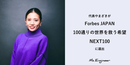 今回、『 Forbes JAPAN』 100通りの世界を救う希望 NEXT100に選出いただき、ありがとうございます。Ms.Engineerをさらにたくさんの方に知っていただく貴重な機会がまた一つ増えたこと、とてもうれしく思っております。