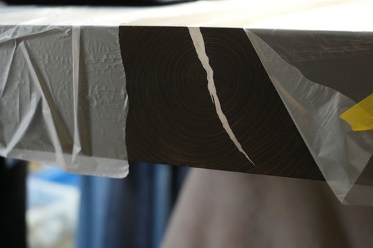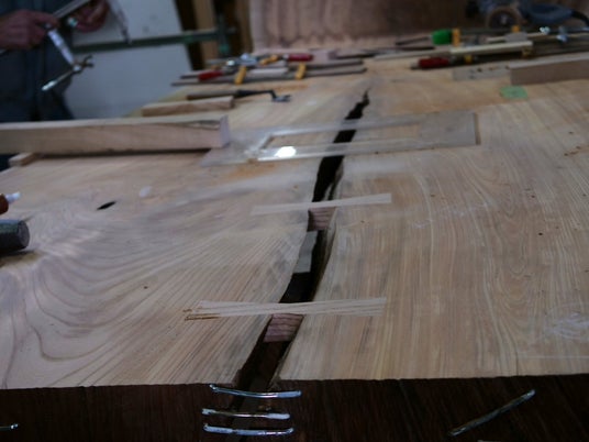 長年培った木材加工技術を駆使し、木部の大きい節に金継ぎ加工をするため試行錯誤をした