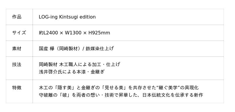 同社の代表作「LOG-ing」。本作は、その素材に国産材・欅を用いて、日本の伝統工芸である金継ぎの技法を融合させた新たな試みである。木工に息づく“隠す美学”と、金継ぎが象徴する“見せる美学”という相反する価値を一本の欅に重ね、日本の伝統工芸・技術に宿る精神性を、現代、そして世界へとつなぐプロダクトとして提案する。