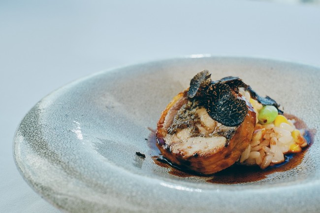 五島地鶏しまさざなみのガランティーヌ 幾久山米と玉蜀黍のリゾット トリュフソース