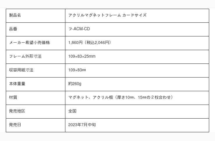 ナカバヤシ株式会社(本社:大阪市中央区、社長:湯本秀昭)は厚みのあるアクリル板で写真を挟み込んで飾るフォトフレーム「アクリルマグネットフレーム」のラインアップにトレーディングカードやチェキなどに対応する「カードサイズ」を追加し2023年7月中旬より全国で発売します。