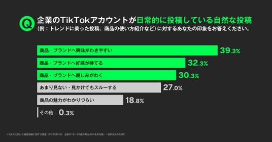 さらに、企業アカウントによる日常的なオーガニック投稿に対しては、39.3%のユーザーが「商品やブランドに興味を持つきっかけになった」と回答。また、TikTokで情報発信を行う企業に対しては、「時代に適応している」「親しみやすい」といったポジティブな印象が多く寄せられました。