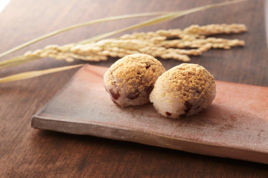 新米の滋賀羽二重糯や大麦、きび、小豆をあわせた餅生地で瑞々しい粒餡を包みました。五穀豊穣を願い、たねやでは生地に稲・麦・きび・小豆をあわせ素朴な味わいに仕上げています。別添の芳ばしいきな粉(大豆)をかけてお召し上がりいただくことで、五穀が揃うおはぎです。