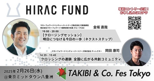 マネーフォワードベンチャーパートナーズ株式会社が運営するHIRAC FUNDは、2025年2月26日(水)に東京ミッドタウン八重洲で開催される、アトツギとスタートアップの共創イベント「TAKIBI&Co. Fes Tokyo(タキビコフェストーキョー)」に登壇します。